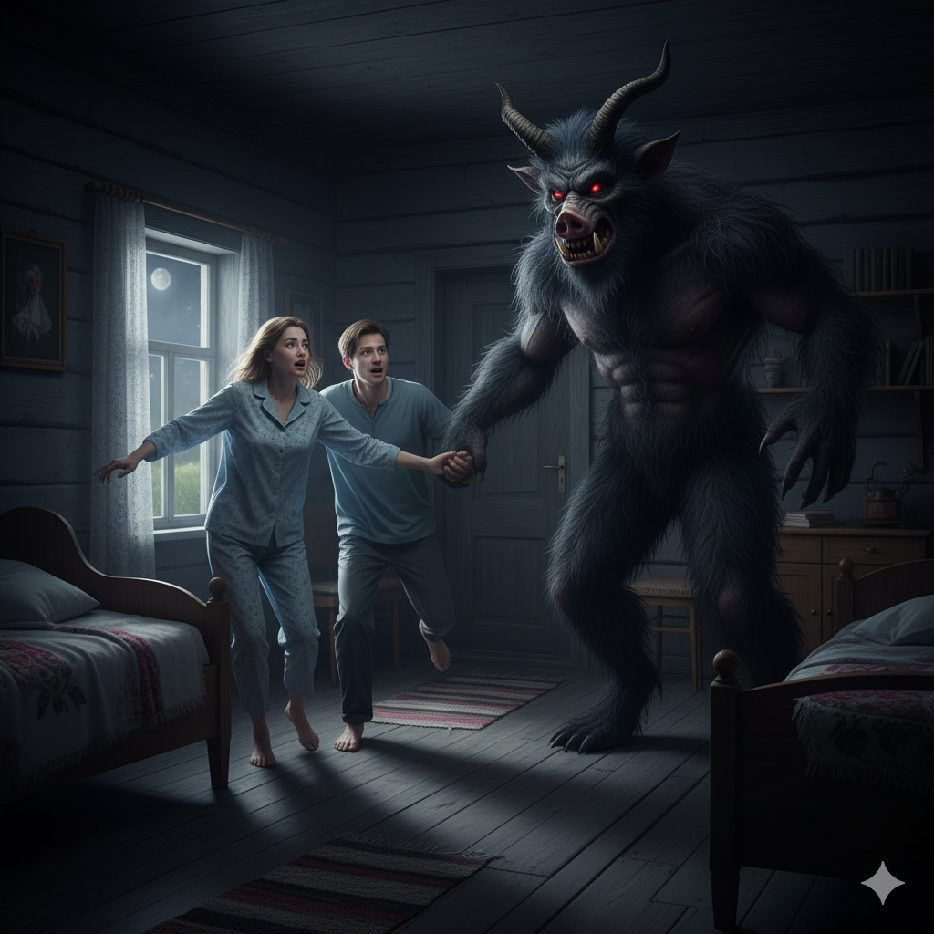 Нина немного успокоилась и прижавшись к мужу заснула. За полночь снова послышалось цоканье копыт. Теперь это тяжёлые шаги, от которых прогибались половицы. Нина проснулась, схватила мужа за руку и посмотрела на него. Он широко открыл глаза и смотрит в сторону, откуда идёт шум. Шаги всё ближе и ближе. Двери в спальни распахнулись, и на пороге показался огромный мохнатый чёрт.