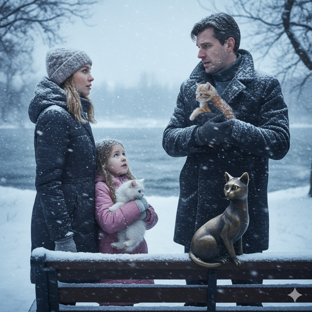 Он поднялся и ушёл в метель, а бронзовый кот остался на лавочке, на которой значилось его имя.