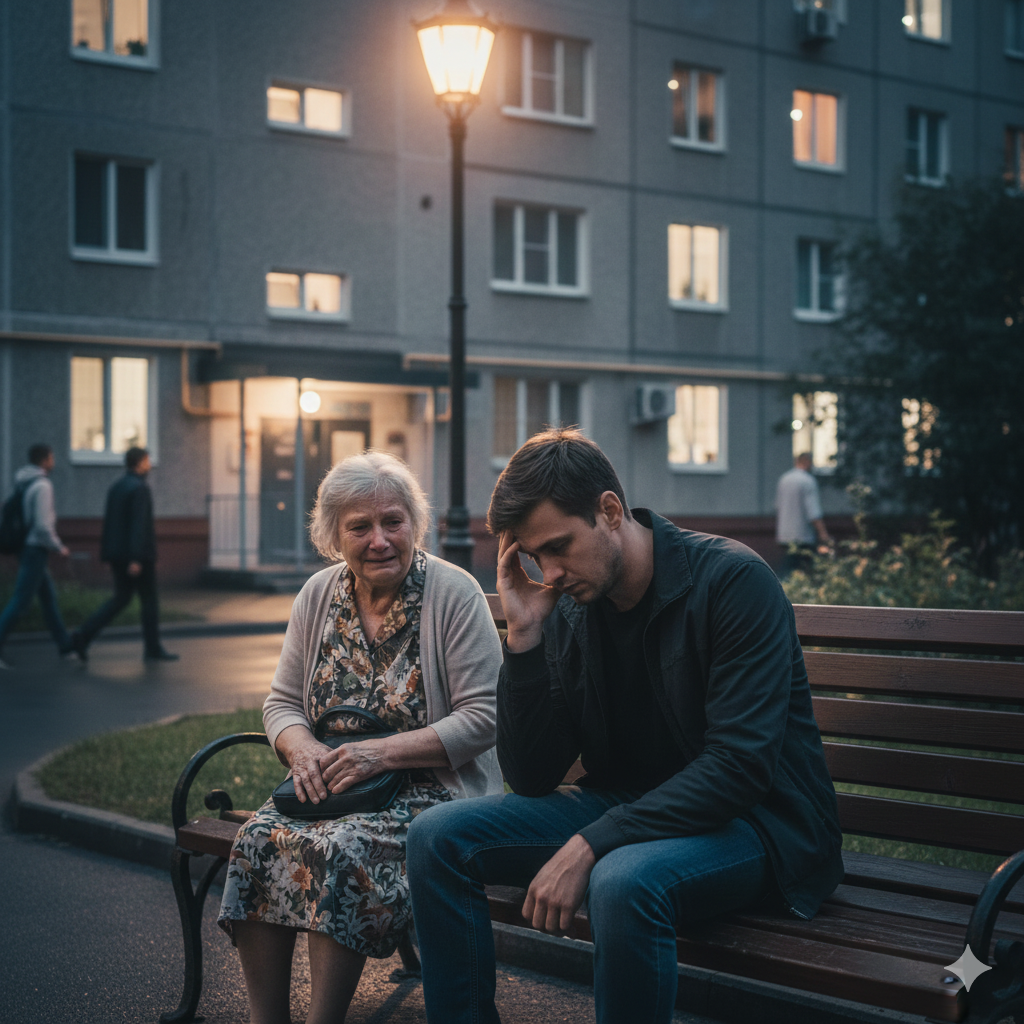 Сидя на скамейке возле дома, Сергей мысленно ругал себя, что не может заработать для семьи даже на необходимое. Вдруг у соседнего подъезда он увидел старушку. На ней было надето летнее платье, несмотря на то, что давно наступил сентябрь. Пожилая женщина плакала, вытирая слёзы. Никто из прохожих не обращал внимания на несчастную.
