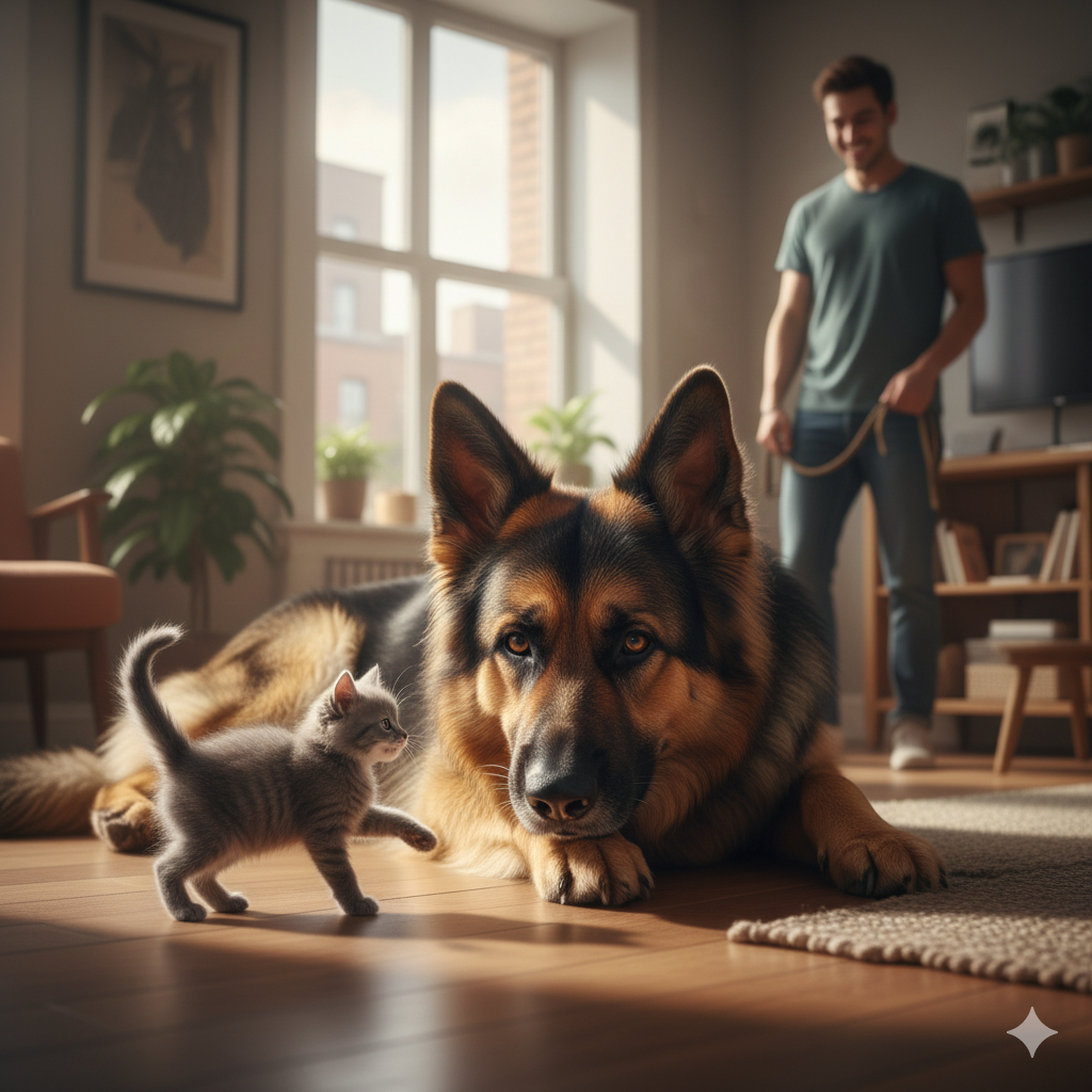 Он не собирался связываться с наглой мелкотой. Однако мелкота думала иначе. Увидев, что пёс испугался его, котёнок приступил к действиям…