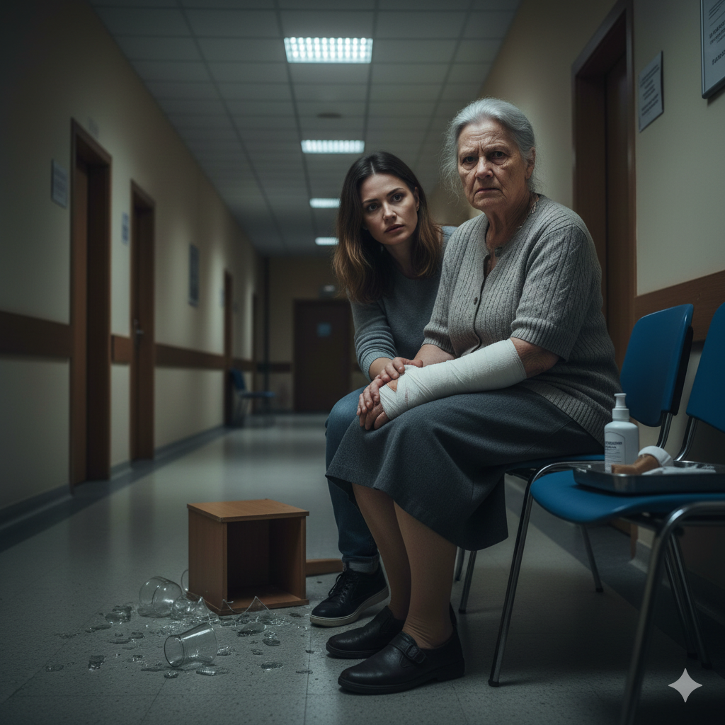 Потом была скорая, больница, дежурный врач, который сказал «сотрясение средней степени тяжести, нужно наблюдение». Галина сидела в больничном коридоре с забинтованной рукой. Марина примчалась в травмпункт красная как помидор. Только и сказала: