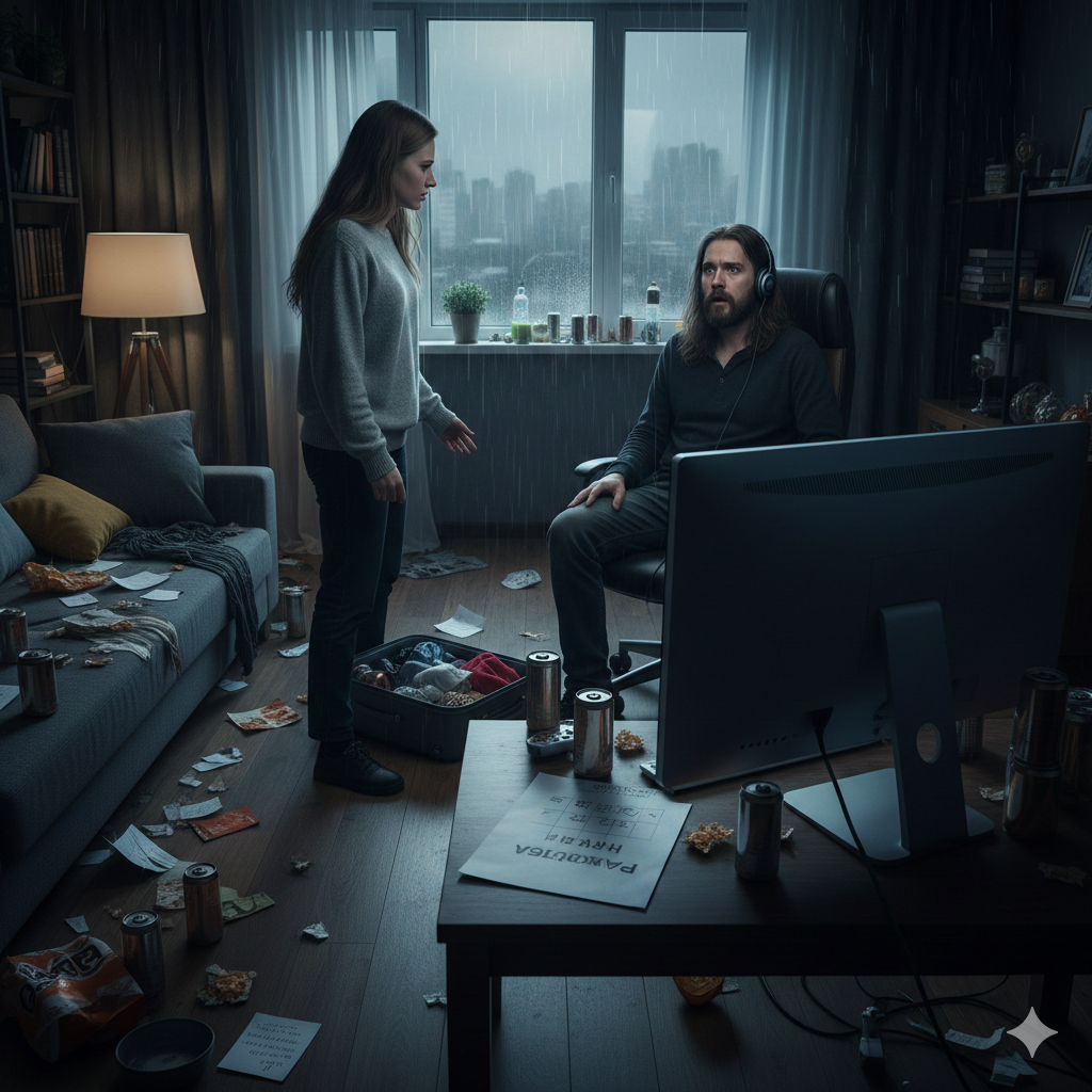 Когда Алина вернулась домой, Сергей сидел за компьютером всё в той же позе, в какой она оставила его утром. Рядом на полу громоздились пустые банки из-под энергетика. Он яростно терзал джойстик и даже не повернулся на звук шагов.