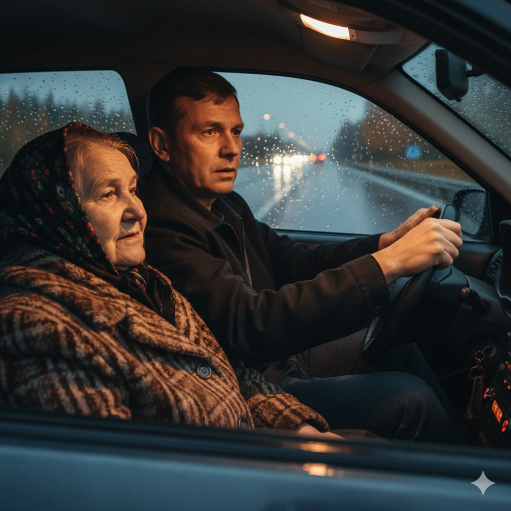 Он выехал на трасу. Уже смеркалось, а до города ехать ещё километров 50. Начался мелкий дождик. Иван включил дворники и пробурчал: «Ещё дождя до полного удовольствия не хватало». Преодолев пару десятков километров, он заметил бредущую по обочине пожилую женщину. Проскочил мимо, проехал немного и нога сама нажала на тормоз. Поблизости вроде бы никаких домов нет, куда идёт эта старушка? Может случилось что-то и помощь нужна? Он развернулся и поехал обратно.