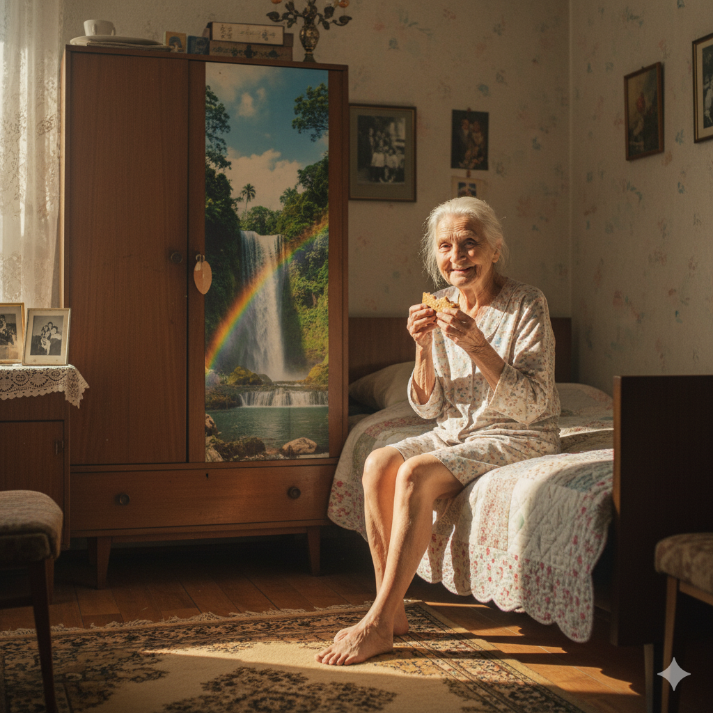 Сын и дочь, задремав ненадолго, услышали звуки, доносившиеся из комнаты матери, и, замирая от страха, тут же примчались. Они ожидали увидеть печальную картину, но Фёкла Николаевна сидела на краю кровати, побалтывая ногами и с удовольствием жевала беззубыми дёснами бутерброд с колбасой, забытый сыном на тумбочке.