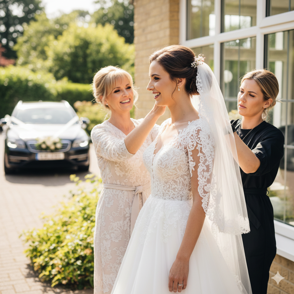 — Минуту, сейчас заканчиваю, — строго отрезала она. Улыбаясь, оглядывая невесту, отходит в сторону, — Всё! Шедевр!