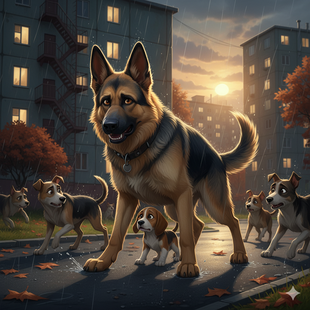 Рекс хотел было всё же научить молодняк уму-разуму, но хозяин потянул пса за поводок и сказал, что нечего связываться с громкими и безмозглыми щенками.
