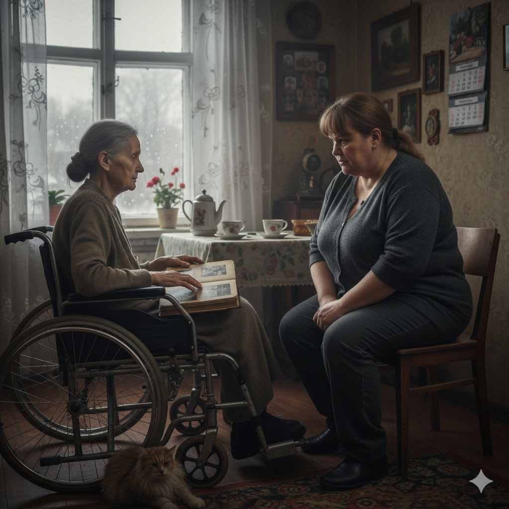 Антонина Тимофеевна сидела в комнате в своей инвалидной коляске, чуть отвернувшись к окну. За мутным стеклом медленно таял серый зимний день, такой же бесцветный, как и все ее последние годы. Ноги давно забыли, что значит сделать шаг. Иногда ей казалось, что они вообще не ее, просто чужие, тяжелые, бесполезные предметы, приставленные к телу. А лицо… лицо неумолимо выдало всё, что пришлось вынести. Боль последних лет прорезала его глубокими бороздами, оставив следы не только возраста, но и утрат, бессонных ночей, отчаяния.