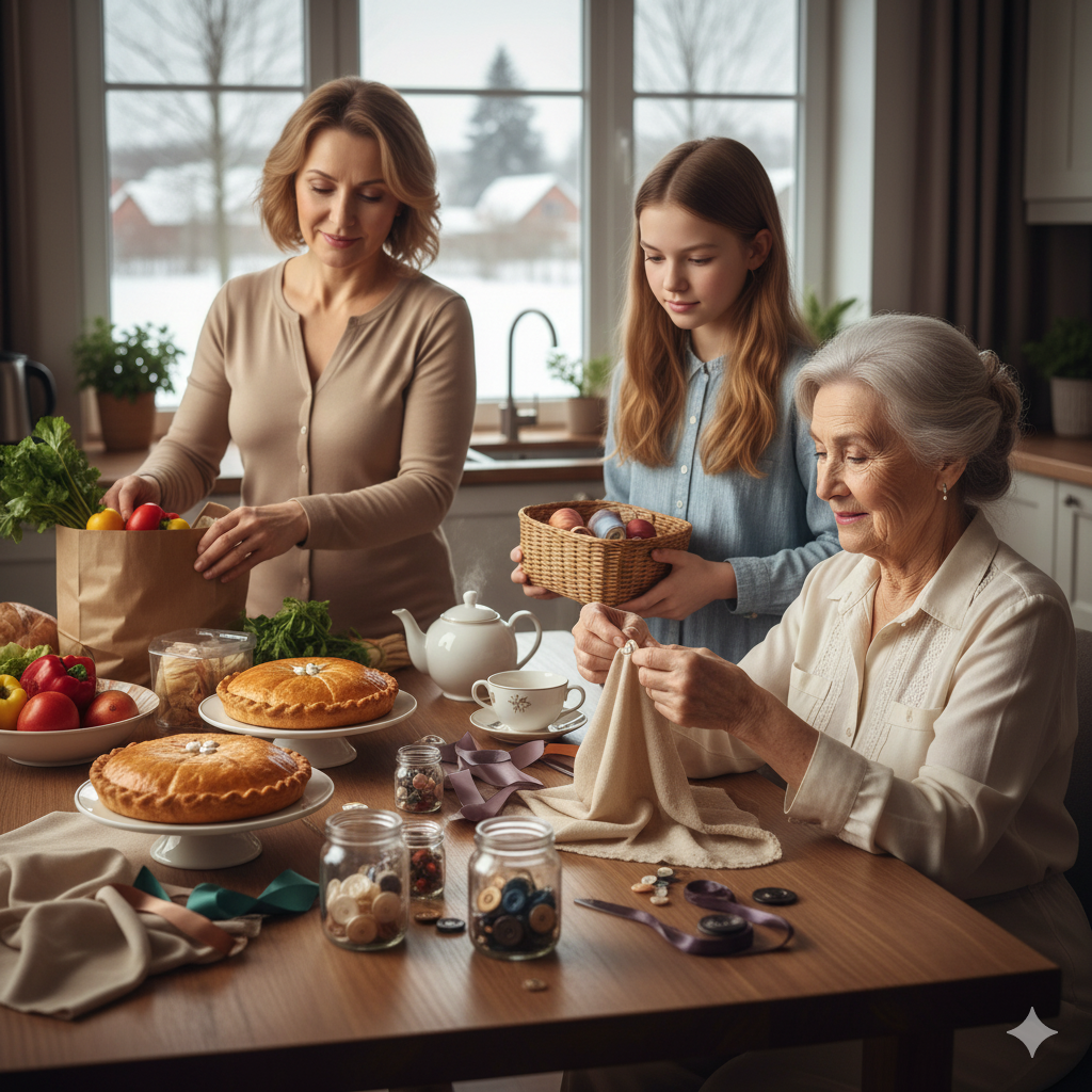 Вечер превратился в настоящее путешествие в прошлое. Анна Петровна доставала из старой шкатулки пуговицы, ленты, кружева, и каждая вещица хранила свою историю.