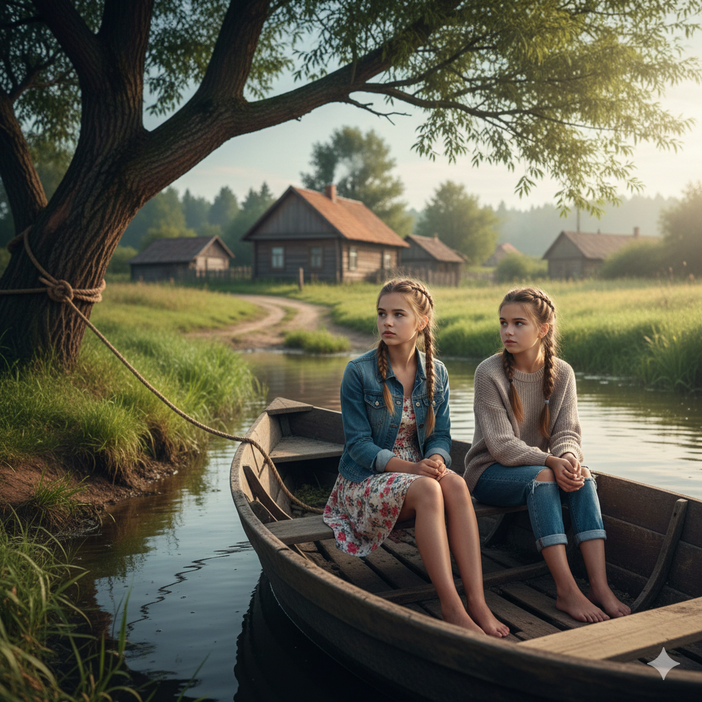Ира с Леной сидели в лодке, привязной к дереву, и опустив ноги в воду, задумчиво смотрели на реку.