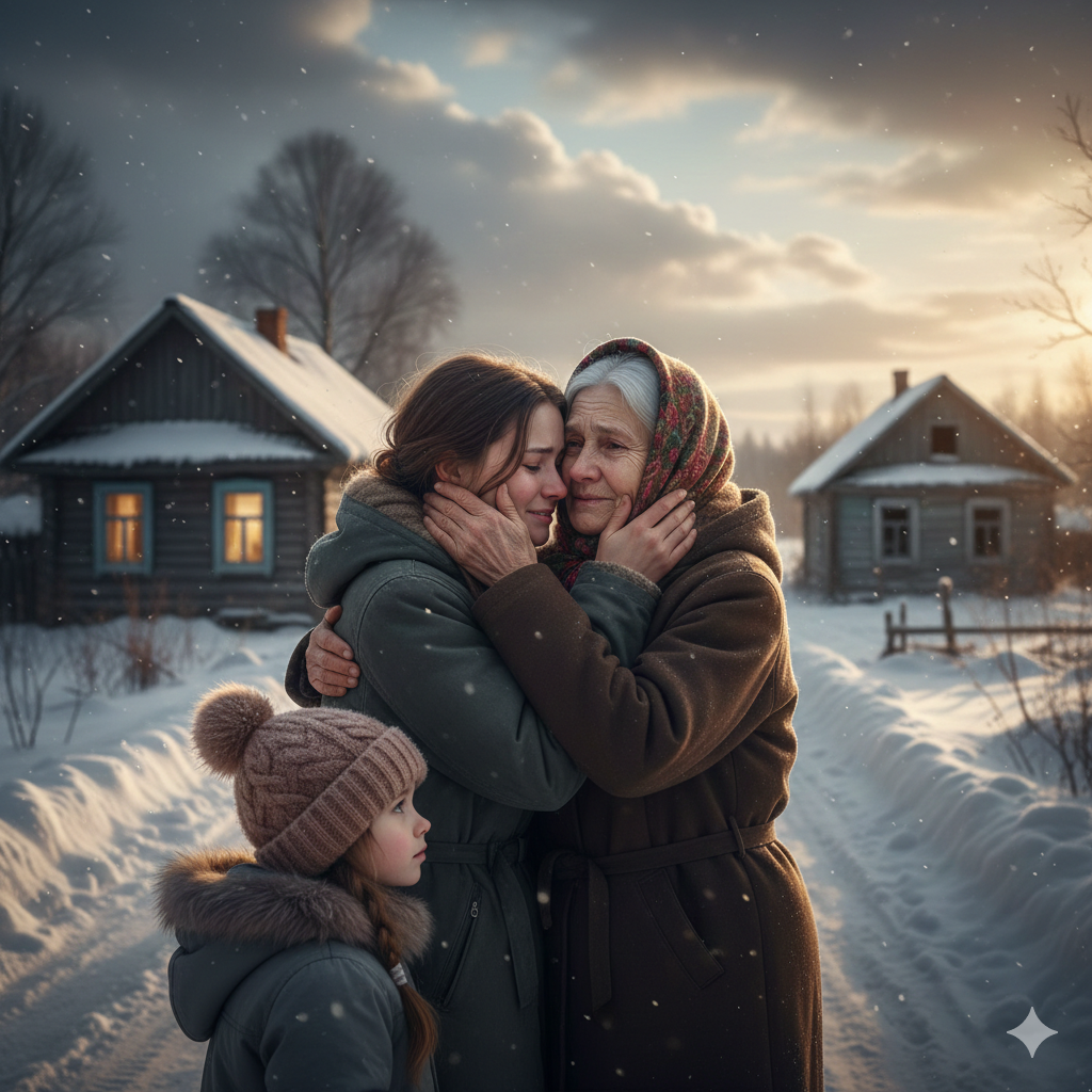 Варя с дочкой вышли из автобуса на краю деревни. Сквозь серые снежные облака пробивалось солнце, мороз пощипывал щёки, а от белого снега так слепило глаза, что Иришка зажмурилась.