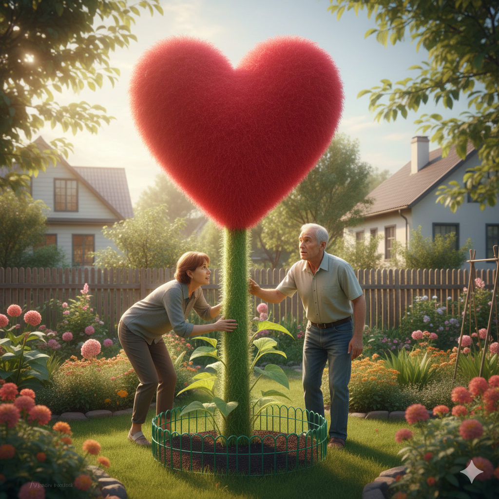 Она поспешила на соседский участок. Открыла калитку и ахнула: Петрович стоял перед исполинским ярко-малиновым цветком, похожим на сердце. Толстенный стебель возвышался на добрых три метра. Пластиковая зеленая оградка обнимала его шершавое основание.