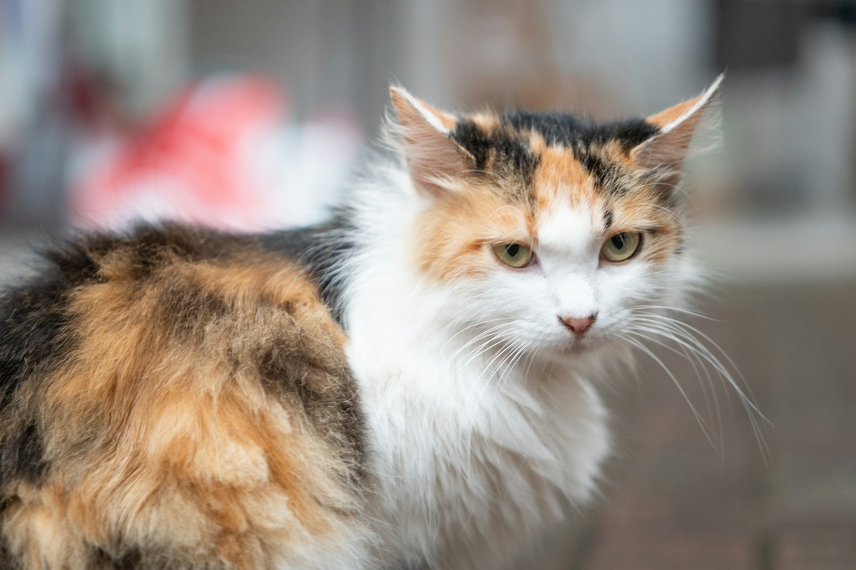 Кошечка была грустная, но красивая. Трехцветная. И вроде еще молодая.