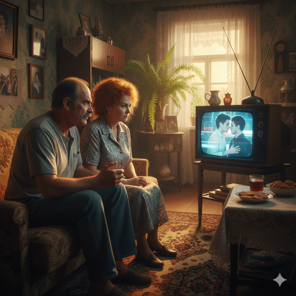 — В каждом фильме есть такие сюжеты, — злился он, поглядывая на жену Риту, та спокойно уткнулась в фильм.