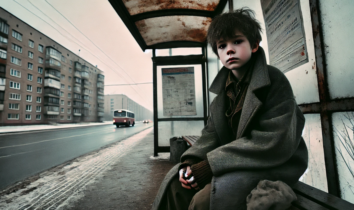 Мальчишка. Лет десяти, может, одиннадцати. Худой, с растрёпанными волосами, в старой куртке, которая давно потеряла форму и явно не грела. Он всегда сидел на одной и той же лавке, ближе к самому углу вокзальной площади, там, где людей было чуть меньше.