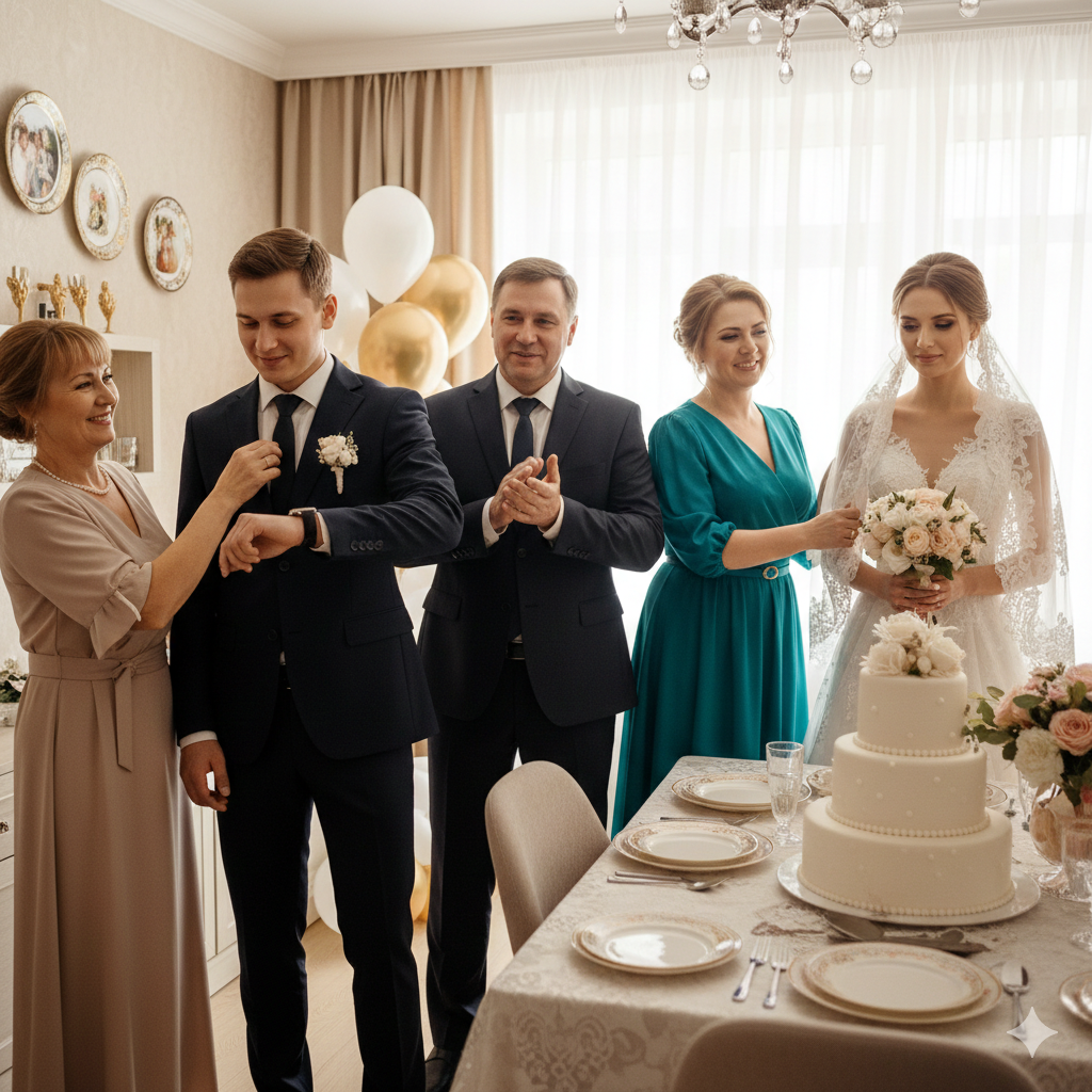 Олег вошел, хлопнул в ладоши: — Так, семья, кареты поданы, едем за невестой!