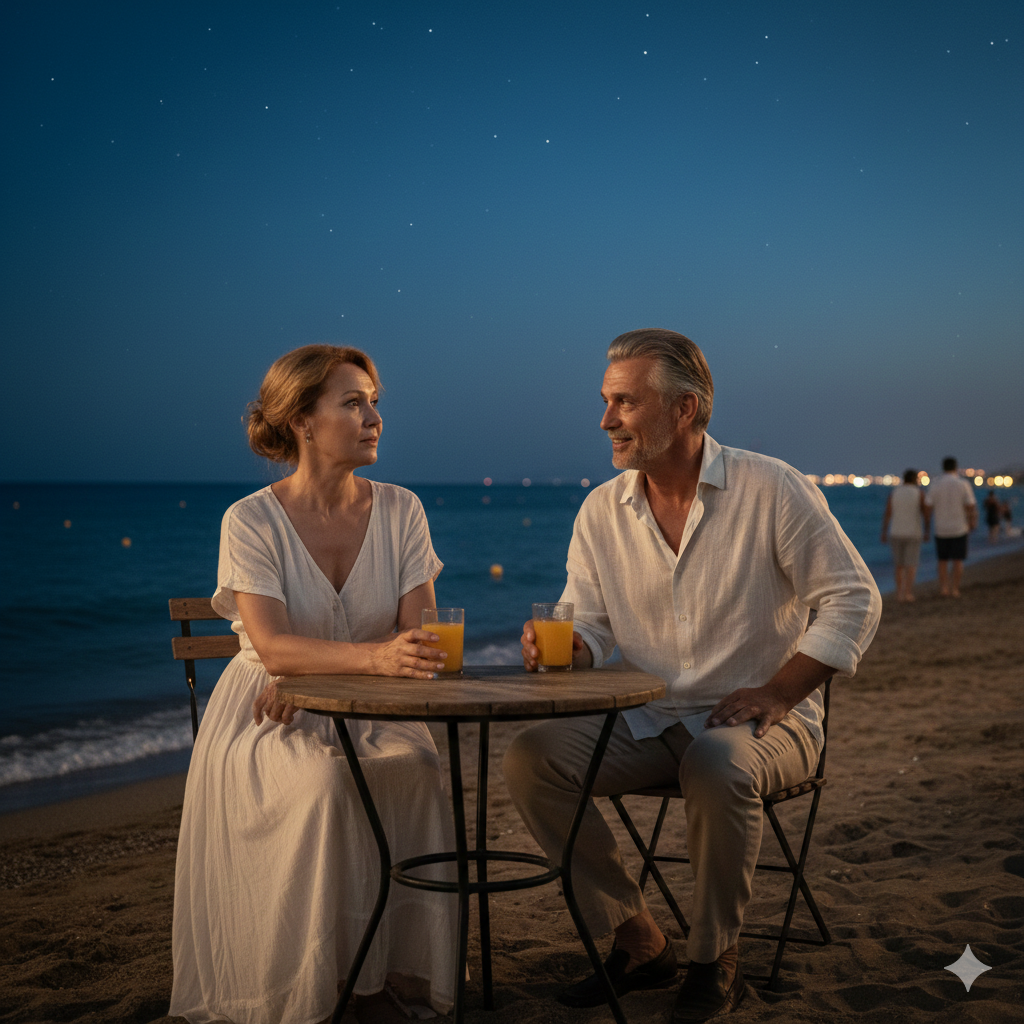 Настал день, когда Светлана с дочкой и внучкой улетели в Турцию, пока прилетели, устроились, ей всё нравилось, и потекли радостные дни, загорали, купались, гуляли, уже прошло четыре дня их отдыха. Вечером Настя с Маришкой остались в номере, а Светлана Петровна пошла прогуляться на пляж, стемнело, уж очень ей нравилось смотреть в чёрное небо на звезды, здесь ночи черней, чем у них дома. Она взяла стакан сока и села за крайний столик, наблюдая за гуляющими по берегу при свете фонарей.