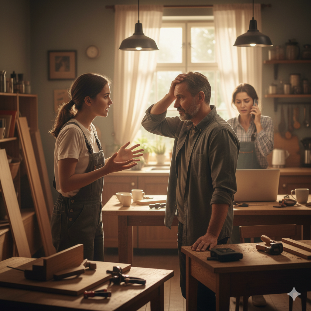 — Пошел в гараж! Работать! – она схватила телефон. – Вот! Комод резной! Стол обеденный! Табуретки восемь штук! Я заказ приняла! Бегом! – Кристина стала толкать папу к двери. – А я проконтролирую!