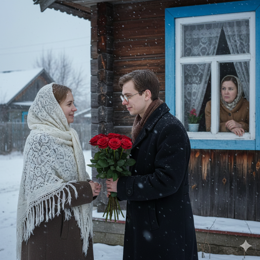 Первые снежинки падали на белоснежный платок Веры, делая её сияющее лицо ещё светлее. Девушка, подобная сказочной фее, встречала своего суженого. Сергей, слегка поклонившись, вручил ей букет роз и обнял. Они осторожно и нежно поцеловались…