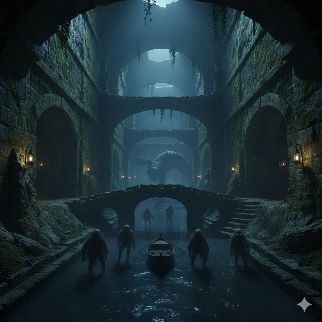 Луч фонаря выхватывал из тёмных стен ниши, наподобие монашеских келий, проходы неизвестного назначения и небольшой каменный мост, дугой протянувшийся с одного берега на другой. Наконец впереди забрезжил свет. Подплыв ближе, мы разглядели несколько маленьких костерков, вокруг которых расположились группками косматые существа. Я не берусь называть их людьми, ибо твёрдо знаю — это не люди. Некоторые сидели у реки и, судя по всему, рыбачили. Увидев лодку, они с пронзительными визгами побежали в сторону костров. Ах, если бы это была самая большая опасность в этих водах…»