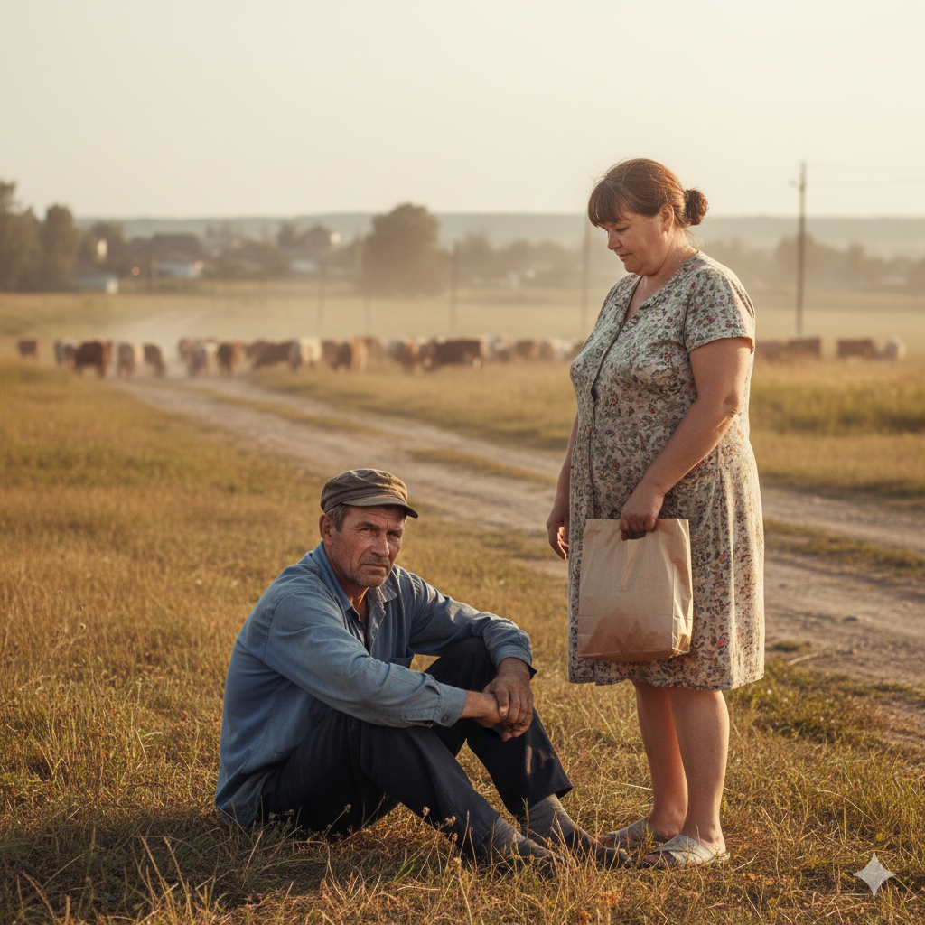 — Коль, приходи домой… — голос Натальи прозвучал тихо, но в полуденной тишине он был слышен так же ясно, как мычание коров. Она уже стояла, переминаясь с ноги на ногу, и в её глазах читалась мольба. — Исхудал ты тут совсем. Полно уж.