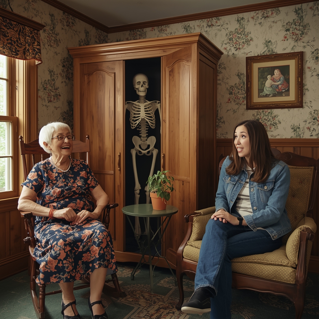 И в этот момент, как назло, в открытую дверь заглянула соседка Валентина Петровна — вечно дежурящая у занавески. Она, конечно, всё увидела. Особенно скелет.