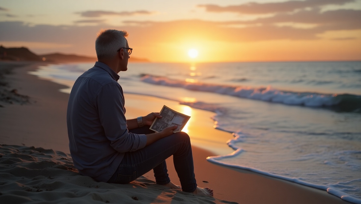 Юрий сидел на берегу и смотрел на воду. Волны лениво лизали песок, солнце клонилось к горизонту, оставляя на небе длинные полосы оранжевого и розового. В руке — старая фотография, выцветшая от времени: мальчик лет пяти, с растрёпанными волосами и широкой улыбкой, сидит на плечах у мужчины в шляпе. Подпись на обороте: «Июль, 1989. Анапа».