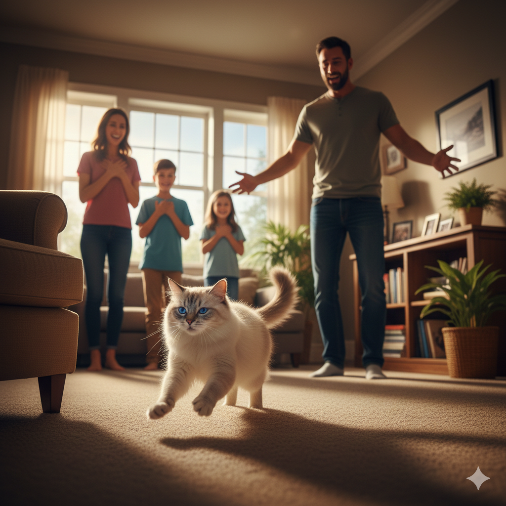 Семья замерла на месте и расступилась. Кошка ещё несколько раз наткнулась по дороге на ножки стульев и упала, и тогда он сам побежал к ней, разведя руки в стороны:
