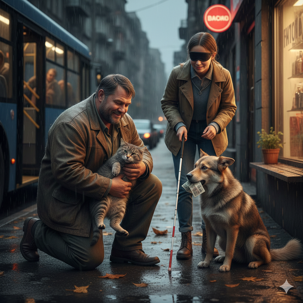 О слепой девушке с добрым сердцем. Её страшном и совсем не страшном муже, и ещё – настоящей дружбе между бездомными псом и котом.