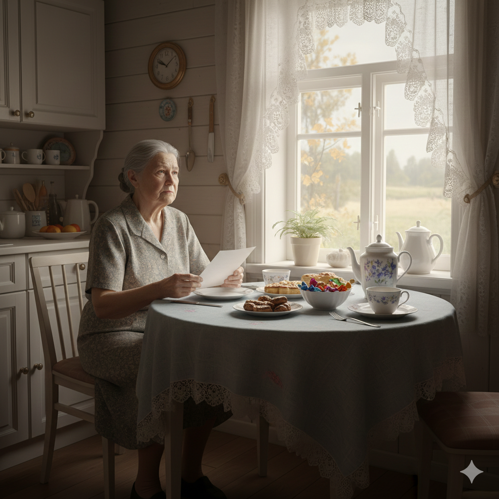 Валентина Ивановна уже много лет жила одна. Муж умер давно, а дети разъехались кто куда. Она до сих пор помнит, как перед отъездом они обещали ей звонить и писать, а как устроятся на новом месте то обязательно забрать её к себе. Однако время шло, но никто её к себе забирать не спешил. Звонили изредка, а приезжали и того реже, но Валентина Ивановна ни разу ни словом, ни делом не показала им, что обижена. Она терпеливо ждала, и каждый день, просыпаясь ранним утром, молила Бога, чтобы он оберегал её детей от всего злого и плохого. После молитвы она ставила чайник и накрывала стол на троих, будто ждала, что вот-вот её Машенька и Василий приедут к ней в гости, и они как и прежде сядут чаёвничать и обсуждать насущные темы. Она неспешно пила чай и рассказывала кому-то невидимому о последних новостях и тайных желаниях, а потом шла во двор, чтобы покормить скотину, подоить корову и собрать яйца.