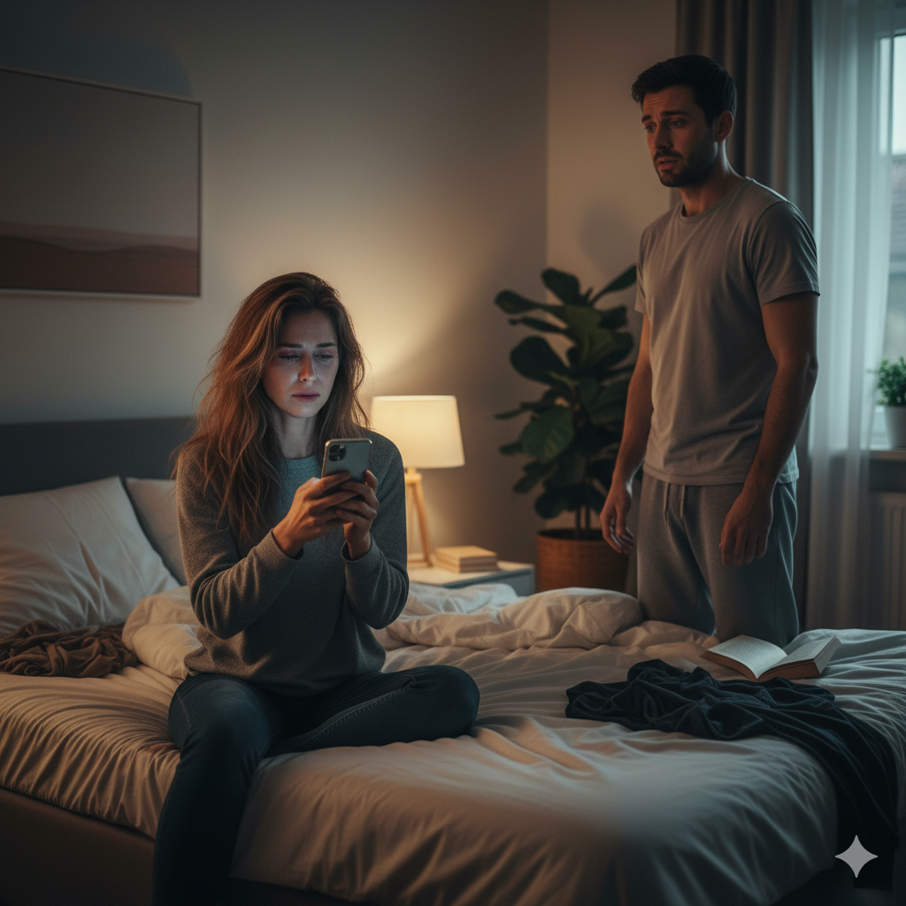 Жена сидела на краю кровати с его телефоном в руках. Лицо бледное, глаза воспаленные – будто давно не спала.
