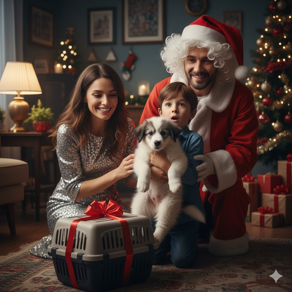 Ребятам красиво упаковали лежанку, чашки, корм и игрушки. Щенок сидел в переноске, а новоиспеченные родители Снежного переодевались в новогодние наряды.