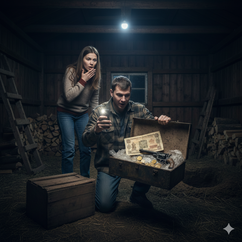 Через час они увидели под дровами железный лист. Под ним Илья обнаружил вкопанный в землю ящик. Вытаскивать его не стал, просто разбил верхние доски. Внутри лежал сверток, обёрнутый целлофаном. В нём кладоискатели нашли старые банкноты царских времён, десяток золотых монет, несколько золотых украшений и револьвер. Всё почерневшее от времени.