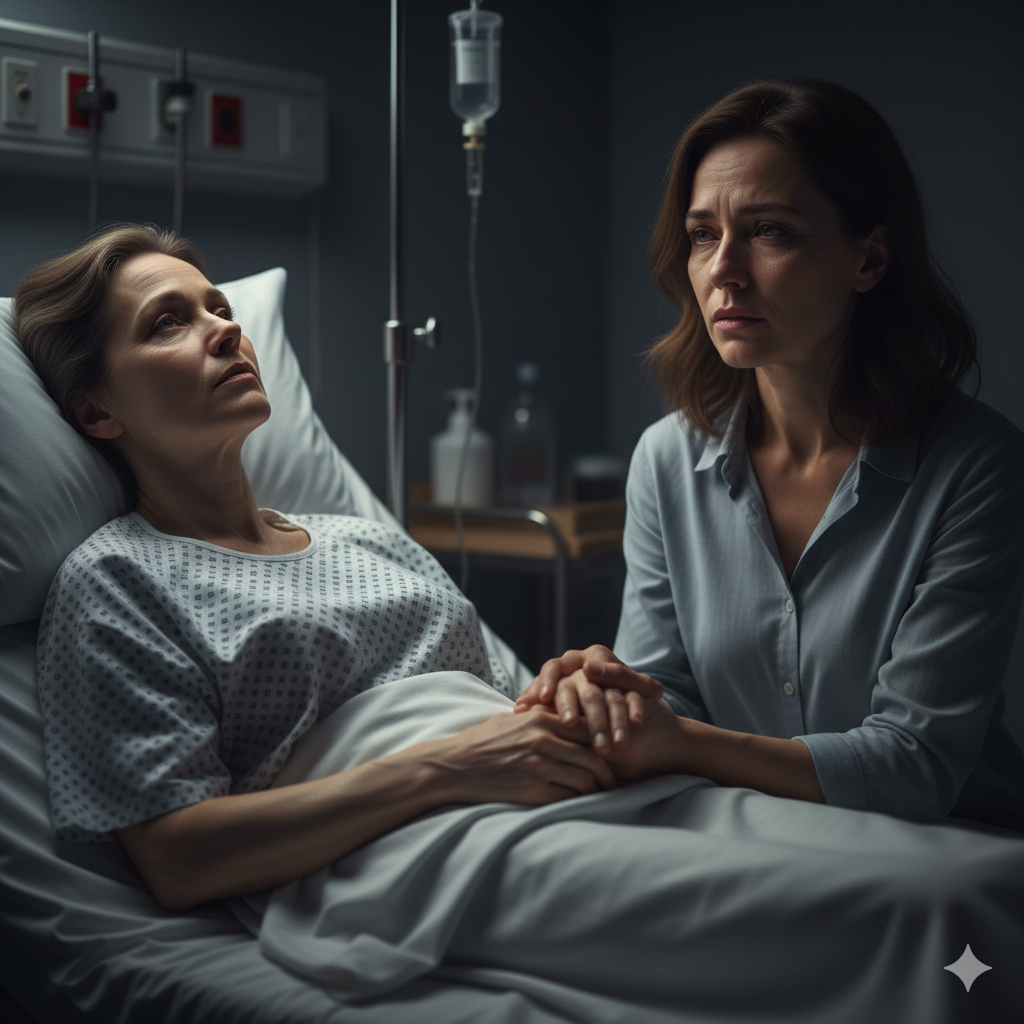 Нина лежала под капельницей. Аня подошла к кровати, взяла её холодную, безжизненную руку и наклонилась низко-низко.