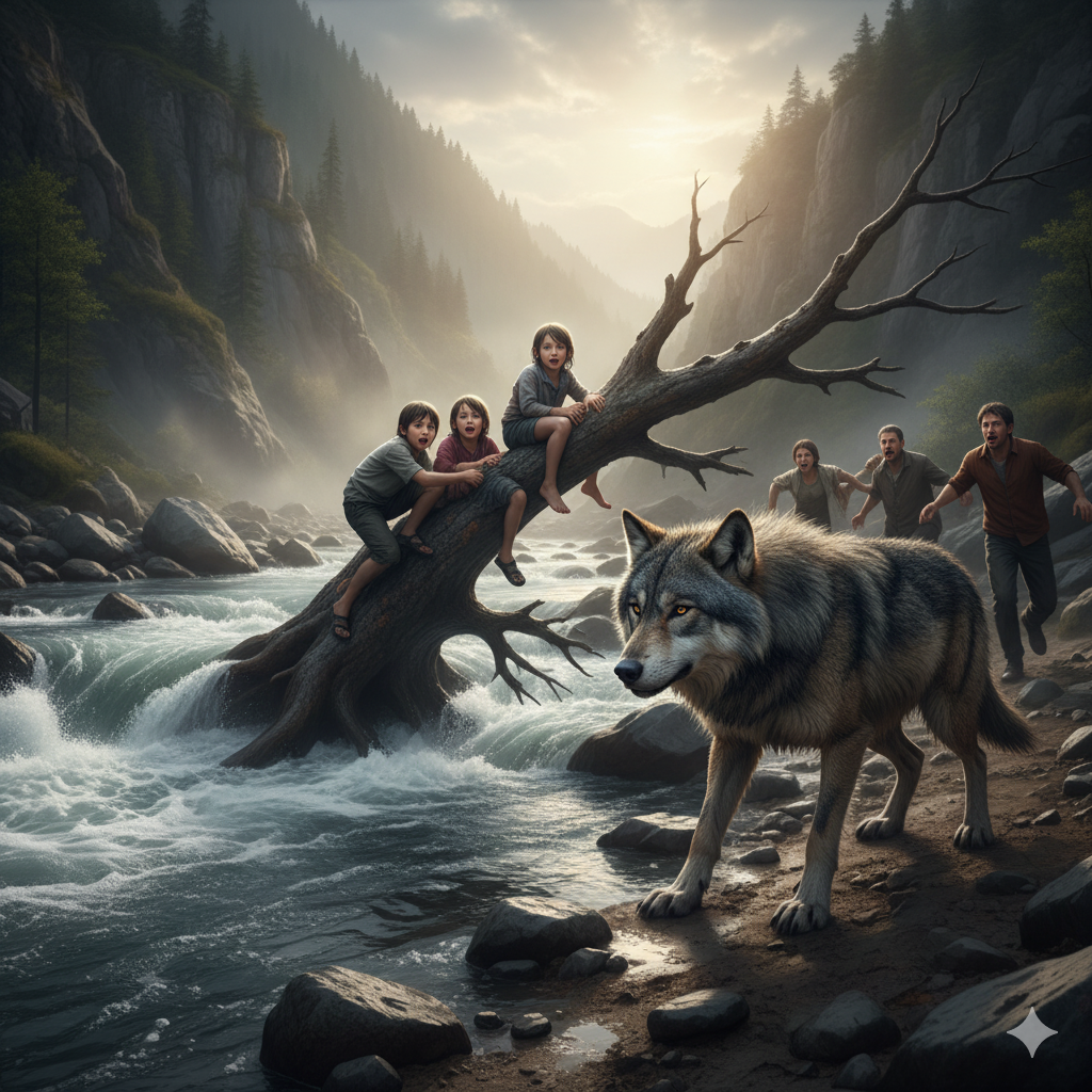 Дерево, проплывая мимо тихой заводи, своими сухими ветками захватило троих детей, после чего понеслось по бурным перекатам. Дети кричали и держались за эти ветви, норовившие вот-вот отломиться.