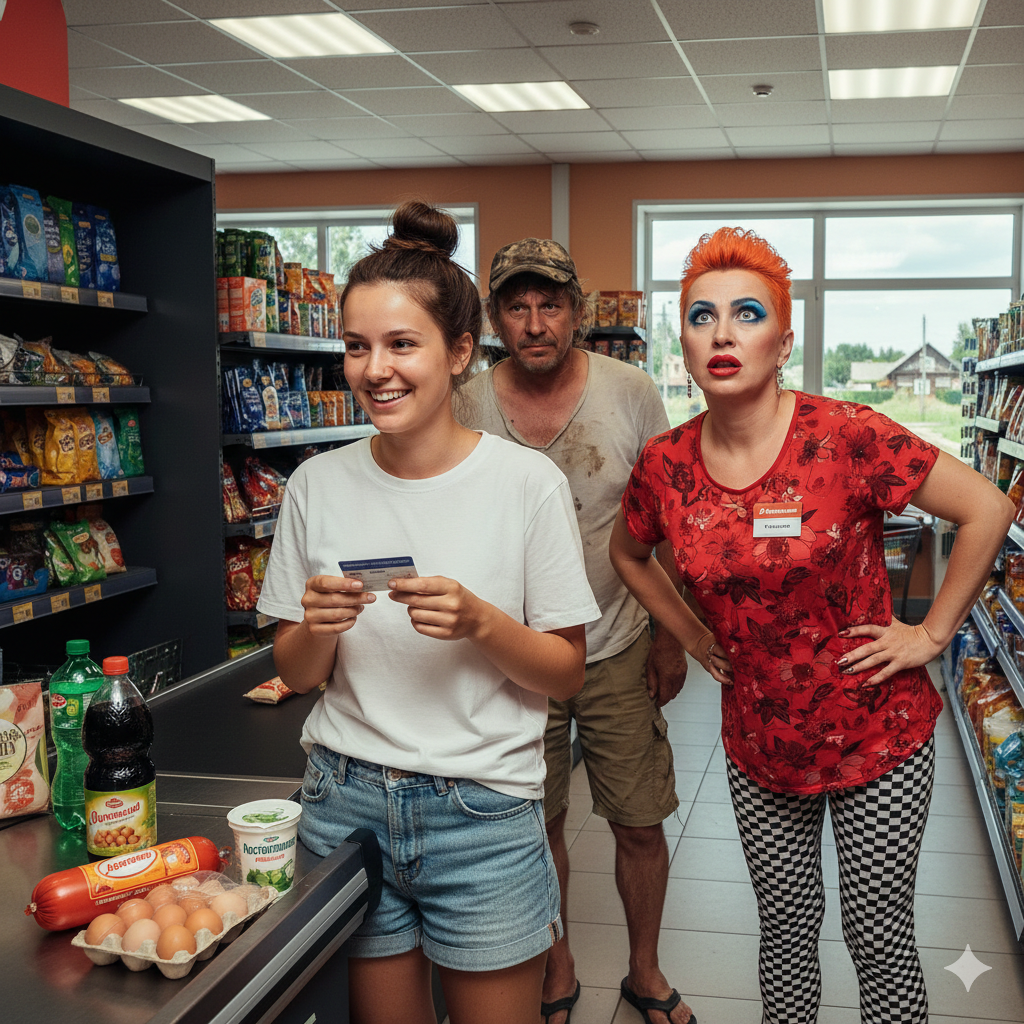 Покупает Настя продукты, за ней стоит покупатель — мужчина в растянутой майке и несвежих шортах, с запахом рыбы или тины.
