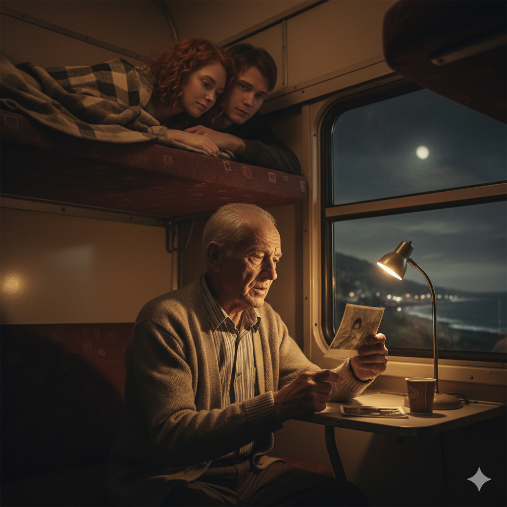 Поезд плавно набрал скорость, и вдруг резко дёрнулся, и она проснулась… Огляделась — всё в порядке, посмотрела вниз — старик полусидя прилёг на своей полке, он держал в руке фотографию. Её освещал его светильник в изголовье, а старик что-то негромко говорил.