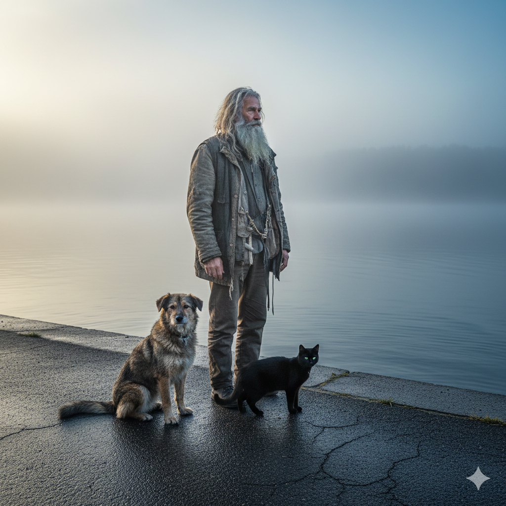 Его бывшая жена вышла из дома и недовольно взглянула на плохо одетого и заросшего бездомного с кошкой и собакой.
