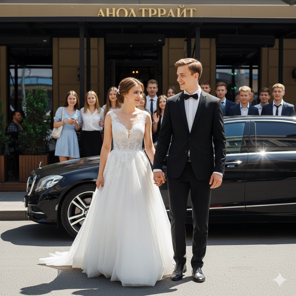 Неподалёку остановился чёрный Мерседес с тонированными стёклами. Из автомобиля вышел молодой мужчина и поспешил открыть дверь спутнице.