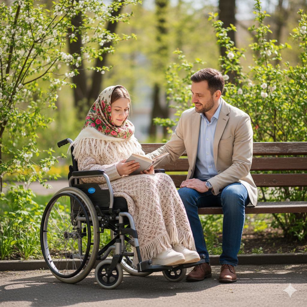 Даша любила природу. Она могла находиться на улице днями и ночами напролёт. Целую прошлую неделю были дожди, а сегодня погодка радовала ярким, согревающим солнышком. Поэтому Даша даже не пряталась в тенёк, а наоборот, поднимала лицо к солнышку, зажмурила глаза и улыбалась. Было прохладно, поэтому Даша накинула на плечи пуховой платок и поправила плед, чтобы не были видны ноги в её инвалидной коляске. Новая книга, забирала всё внимание Дарьи, она очень любила читать и делала это каждый день. В этом небольшом саду, на окраине города, где Даша знала каждое дерево и кустарник, она чувствовала себя как дома.