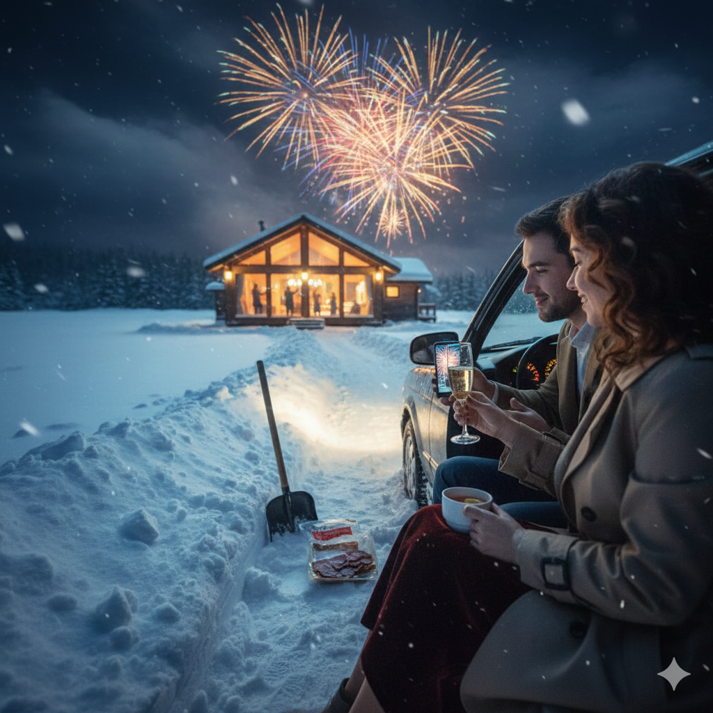 Да, всё пошло не по плану. Но где ещё встретишь полночь вот так — на просёлочной дороге, с незнакомым водителем, с бокалом шампанского, куда незаметно залетают снежинки? В этот момент она ощутила странную, почти волшебную гармонию: будто сама судьба мягко подправила её маршрут, подарив нечто особенное.