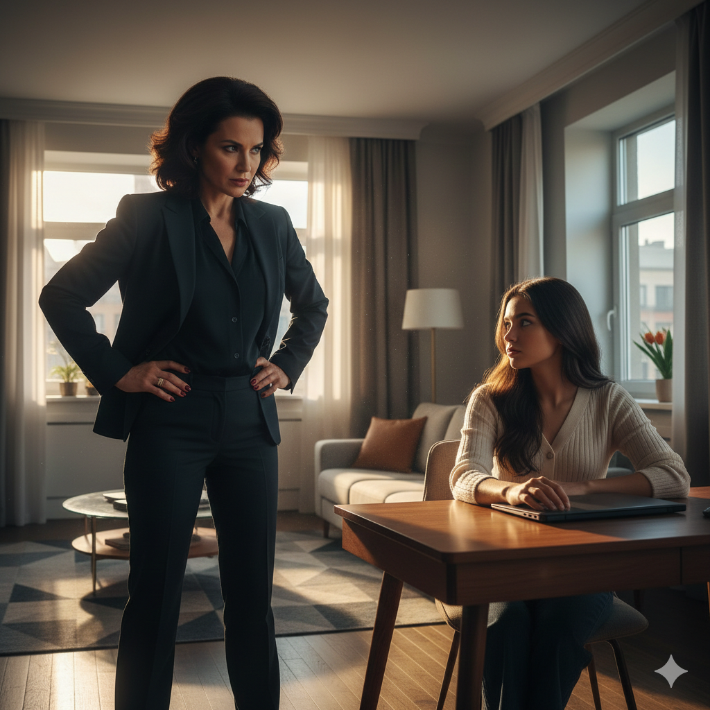 Анастасия молча наблюдала, как дочь торопливо убирает со стола, собирает вещи, проверяет макияж в зеркале. В комнате повисла напряжённая тишина, нарушаемая лишь шорохом одежды и звоном бижутерии.