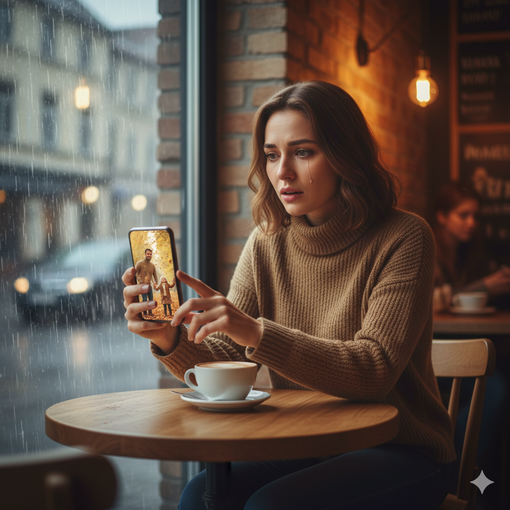 Сегодня она сидела в небольшом уютном кафе неподалёку от дома. За окном моросил осенний дождь, капли стекали по стеклу, рисуя причудливые узоры. На столе перед Аней стояла чашка остывшего капучино, лежал раскрытый блокнот с набросками планов на неделю и смартфон. Она лениво листала ленту соцсетей, по привычке прокручивая посты, ставя лайки знакомым фотографиям, пока вдруг не замерла.