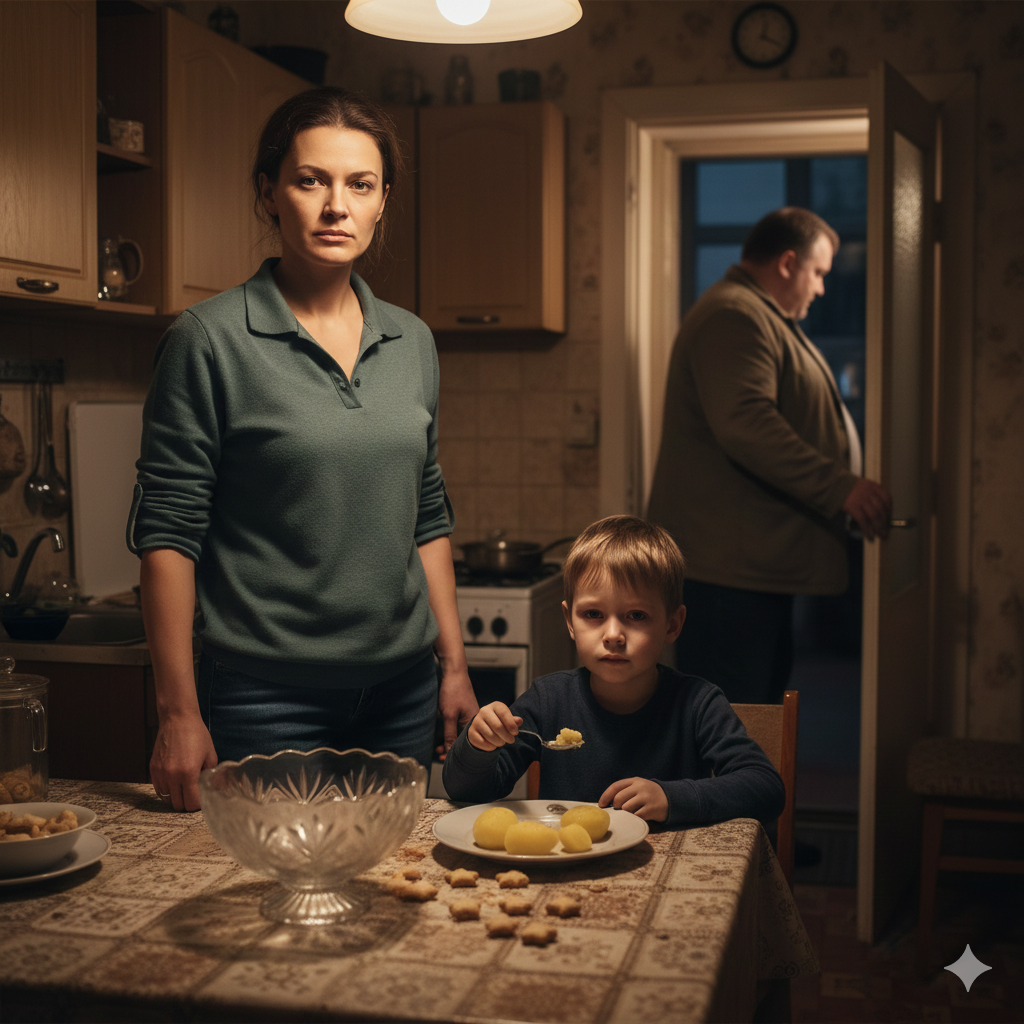 Он заплакал — громко, навзрыд. Слёзы покатились по щекам, капая прямо в тарелку с остывшей картошкой. Тело мальчика сотрясалось от рыданий, он пытался что-то сказать, но только всхлипывал.