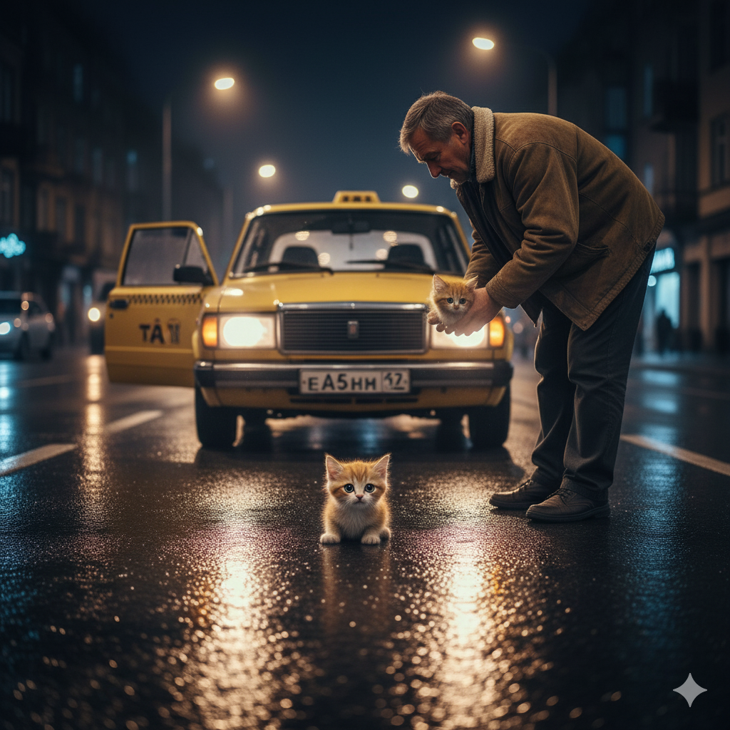 Посреди дороги, прямо под ослепительным светом ночных фонарей, сидел крошечный котёнок. Таксист вышел из машины и поднял малыша.