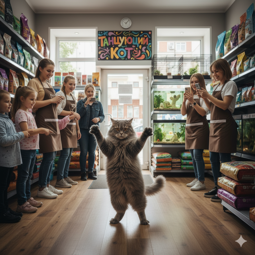 Том переименовал магазин. Теперь вместо скучного “Зоомагазин” красуется сверкающая огнями вывеска — “Танцующий кот”!