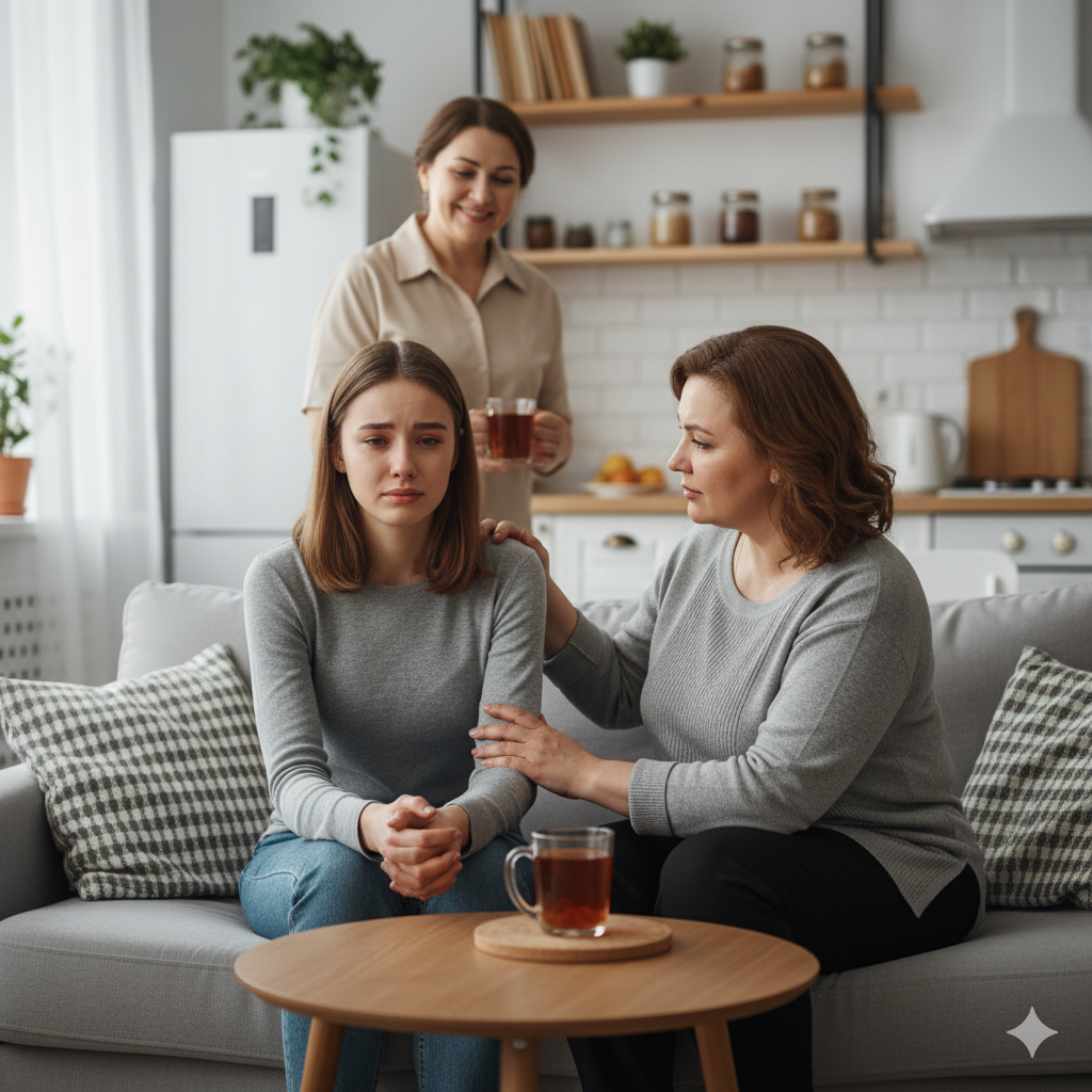 Войдя в квартиру, усадила ее на диван.