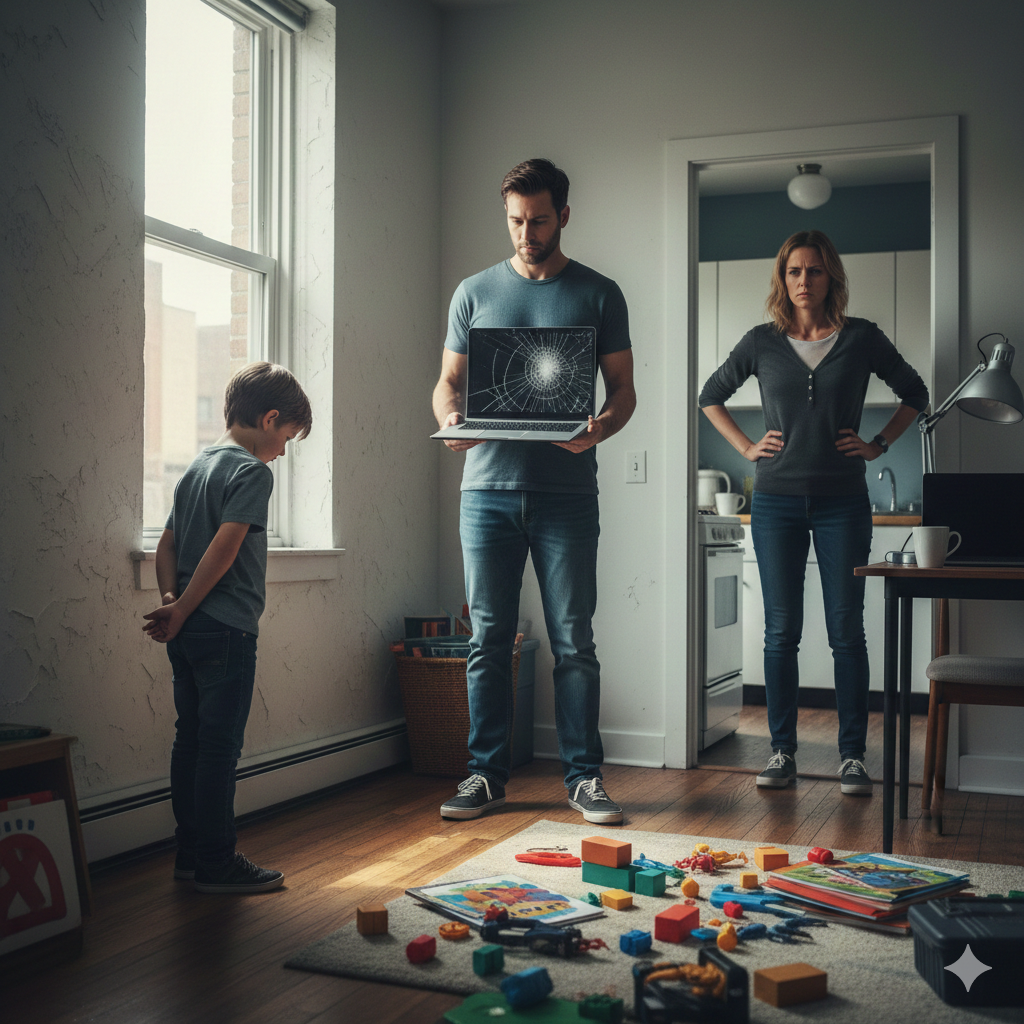 Мой семилетний сын съёжился у стены, стараясь стать невидимкой. А я стоял с этим мёртвым ноутбуком в руках и понимал — это не про сломанную вещь. Это про то, кто в этом доме чужой.