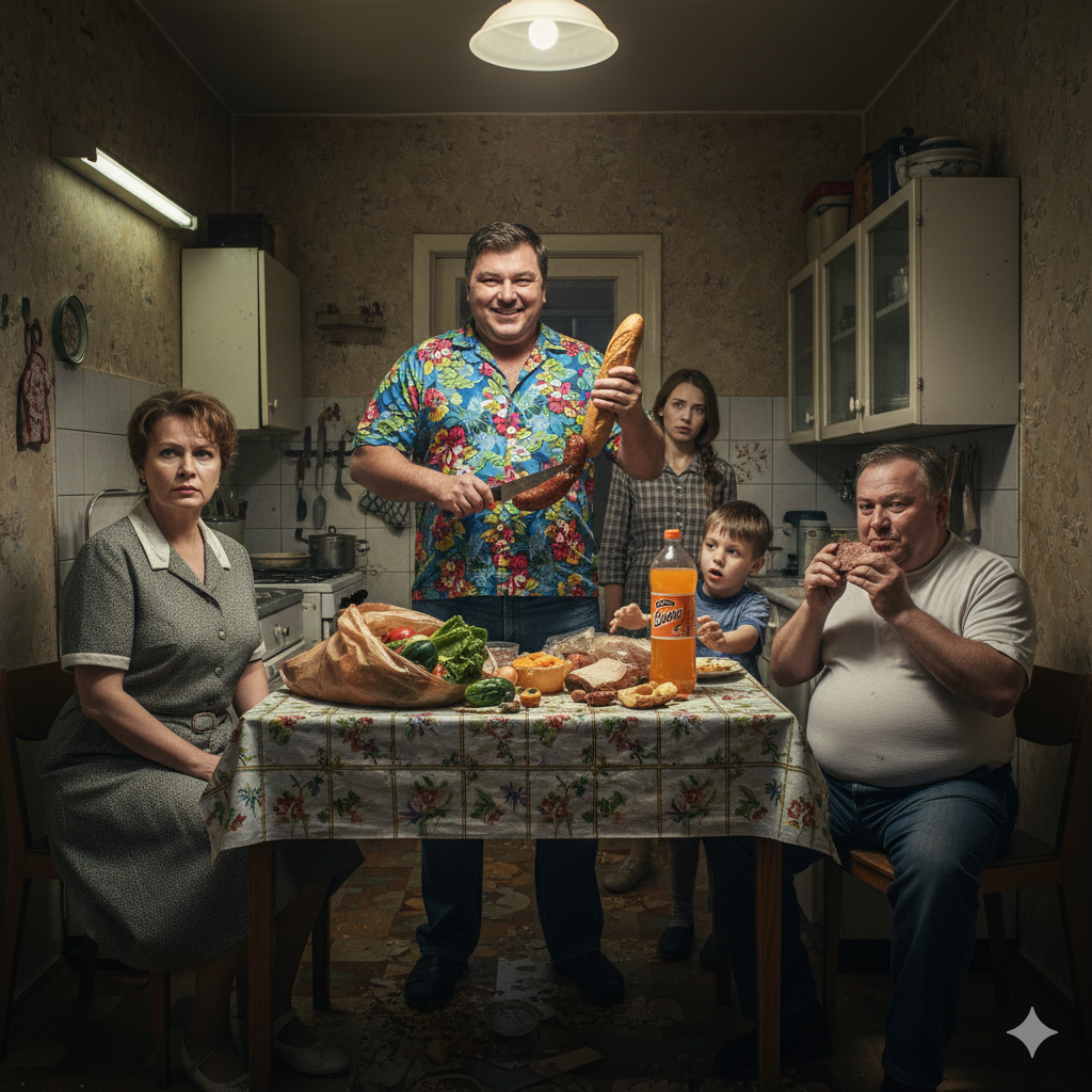 Виктор Петрович дрожащей рукой взял кусок багета с колбасой. Посмотрел на жену. Потом на брата. Потом на колбасу. Запах копчёностей ударил в нос, пробуждая что-то древнее, забытое. Он откусил. На лице отразилось блаженство.
