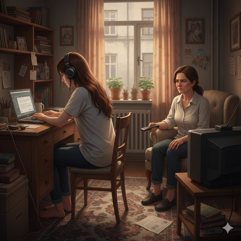 Лариса уселась за свой стол с ноутбуком, натянула наушники, повернулась к матери спиной. Та угрюмо включила телевизор, нашла известное ток-шоу, которое особенно ненавидела старшая дочь. Включила звук на полную громкость, хоть и понимала, что в своих наушниках та ничего почти не услышит. Тупо смотрела в экран, не вникая в слова ведущего. По щекам её катились злые, солёные слёзы…