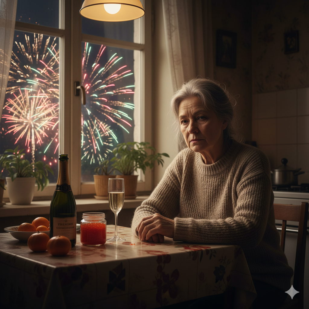 Через год они встречали Новый год вчетвером. А Валентина Викторовна сидела одна за кухонным столом, на котором стояло дорогое шампанское, икра и мандарины. В этом году сын забыл поздравить ее, а может, и не захотел. Вокруг царила суета, где-то гремели салюты, а лишь одна женщина сидела у окна, считая падающие снежинки.